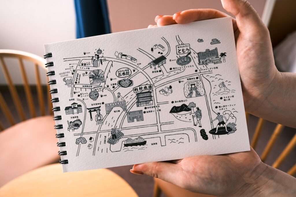 さらには、日南市でスケッチブックを製造する宮崎マルマン株式会社とともに、ホテルシーズン日南にしかないオリジナル旅ブックをつくった。油津のまちを周遊できる便利な塗り絵マップがあり、文字通り、旅の思い出を彩ることができる。