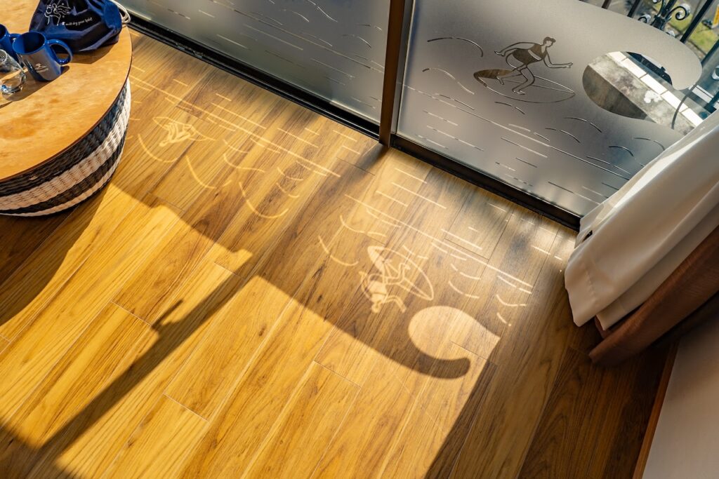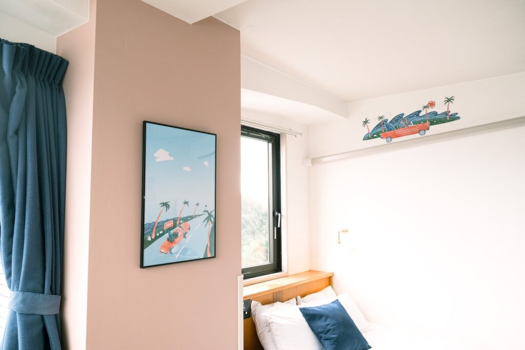 客室の一部を南国感ある温かな色味で塗装。壁やガラス戸を彩る遊び心あるイラストに、思わず笑みがこぼれる。これは宮崎県を拠点に活動するデザイン事務所「はなうた意匠室」によるアートワークで、ホテルの新コンセプトに合わせて制作されたものだ。